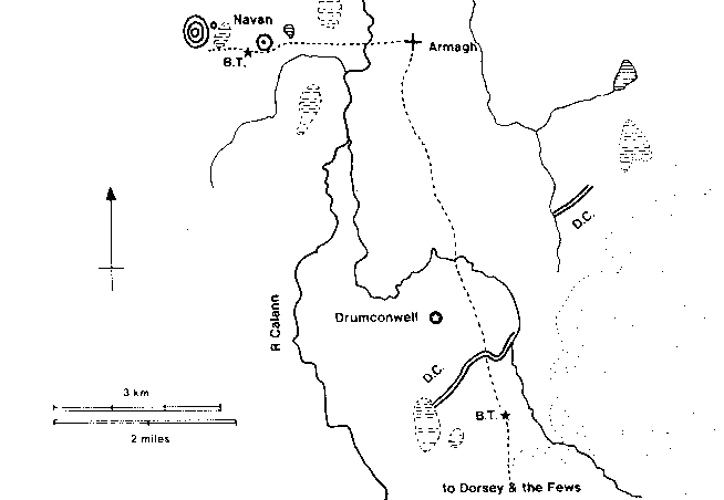 A routeway seems to have run roughly south to north across Sliab Fuait (roughly the south Armagh hills, often called the Fews though this name does not derive from the first but comes from Fiodhbadh - ‘a forest’). This route seems to have run through the earthwork enclosure at Dorsey (Lynn 1989), then on past Carrigatuke, through Lisnadill, where it is marked by a stone known locally as the Bull’s Track, and on to Armagh and Navan. Just north of the Bull’s Track the date, old road passes through a linear earthwork, the ‘Dane’s Cast’, that runs south-westwards through Latmacollum, Lisnadill and Killyfaddy. A small excavation on the earthwork at Killyfaddy failed to site provide evidence of date (Lynn 1988) though the position of the earthwork, straddling the same route as the Dorsey, supports the idea that it should be the same date as that earthwork, around 100 BC, and therefore the same date as the Navan ‘40 metre structure’ (Lynn 1989). In addition, with a small piece of earthwork north-east at Killeen, this Dane’s Cast the gives every appearance of defending Navan, as the map shows. The Drumconwell site is just west of the probable line of the routeway and one kilometre north of the western end (as we have it) of the Dane’s Cast. It some is difficult to believe that this is coincidental, particularly if we are right in regarding Drumconwell as a candidate for Oenach Macha, for the route joins the three places we mentioned above as forming the triad of Macha. Drumconwell is 5km. south of Armagh and 6 km SSW of Navan …